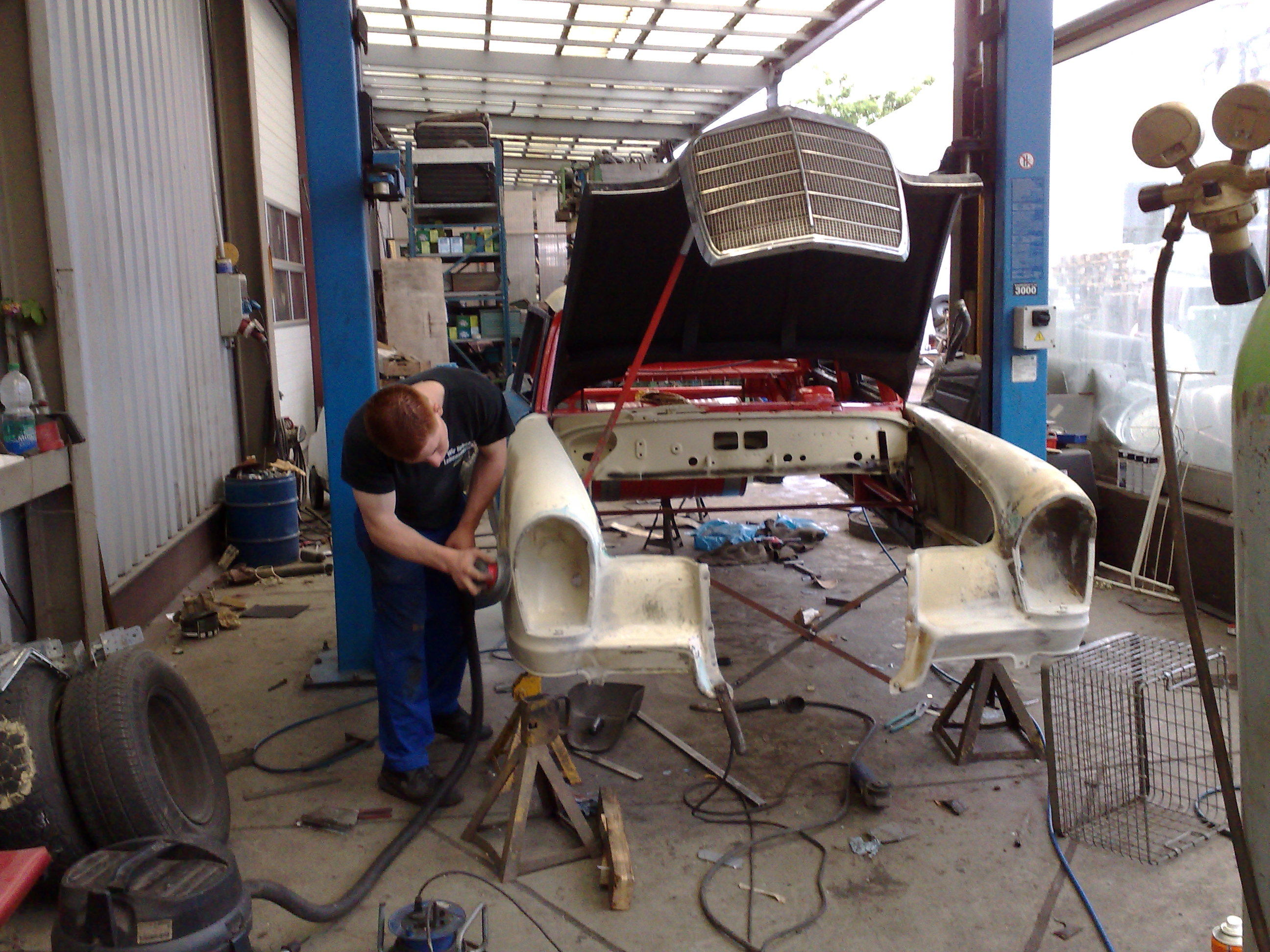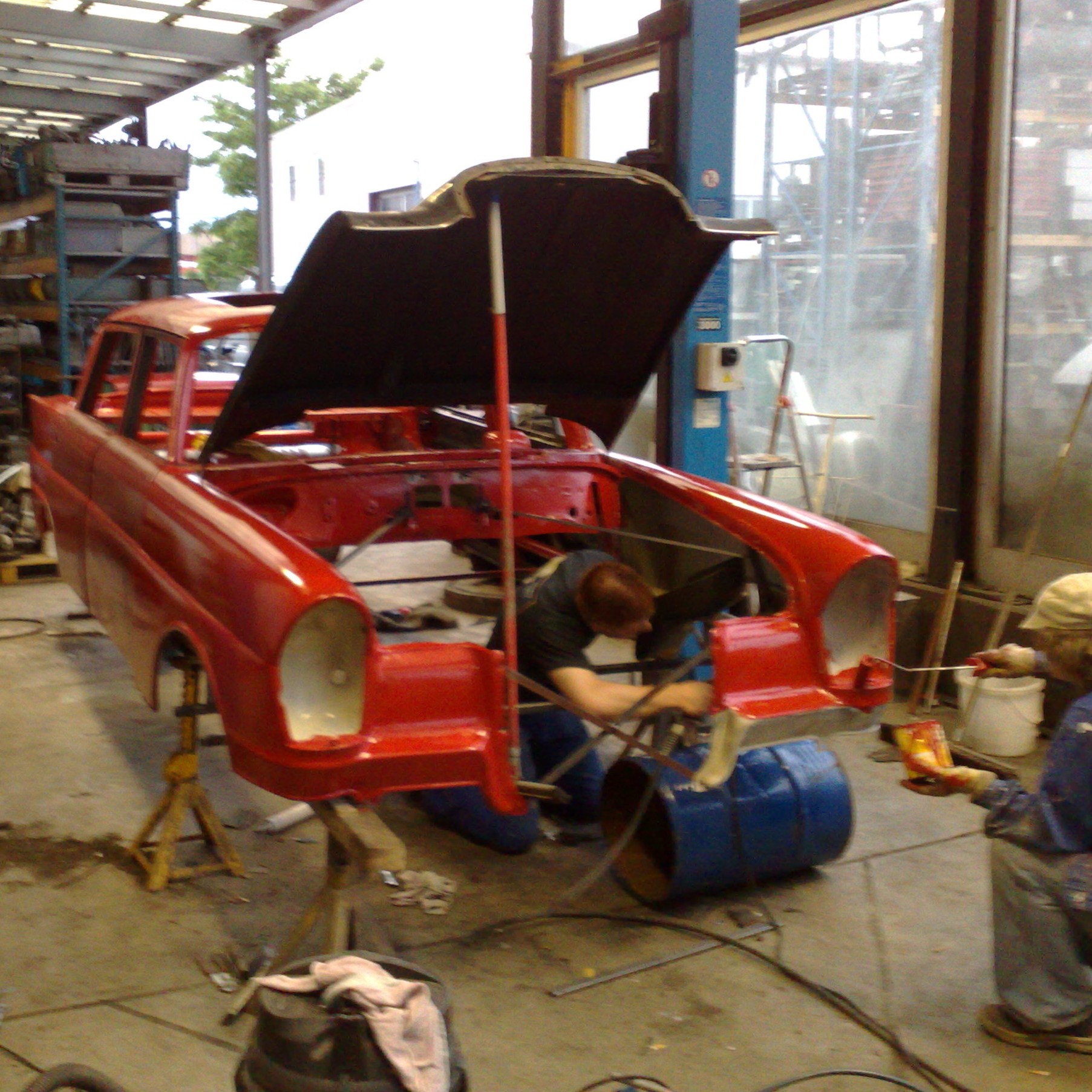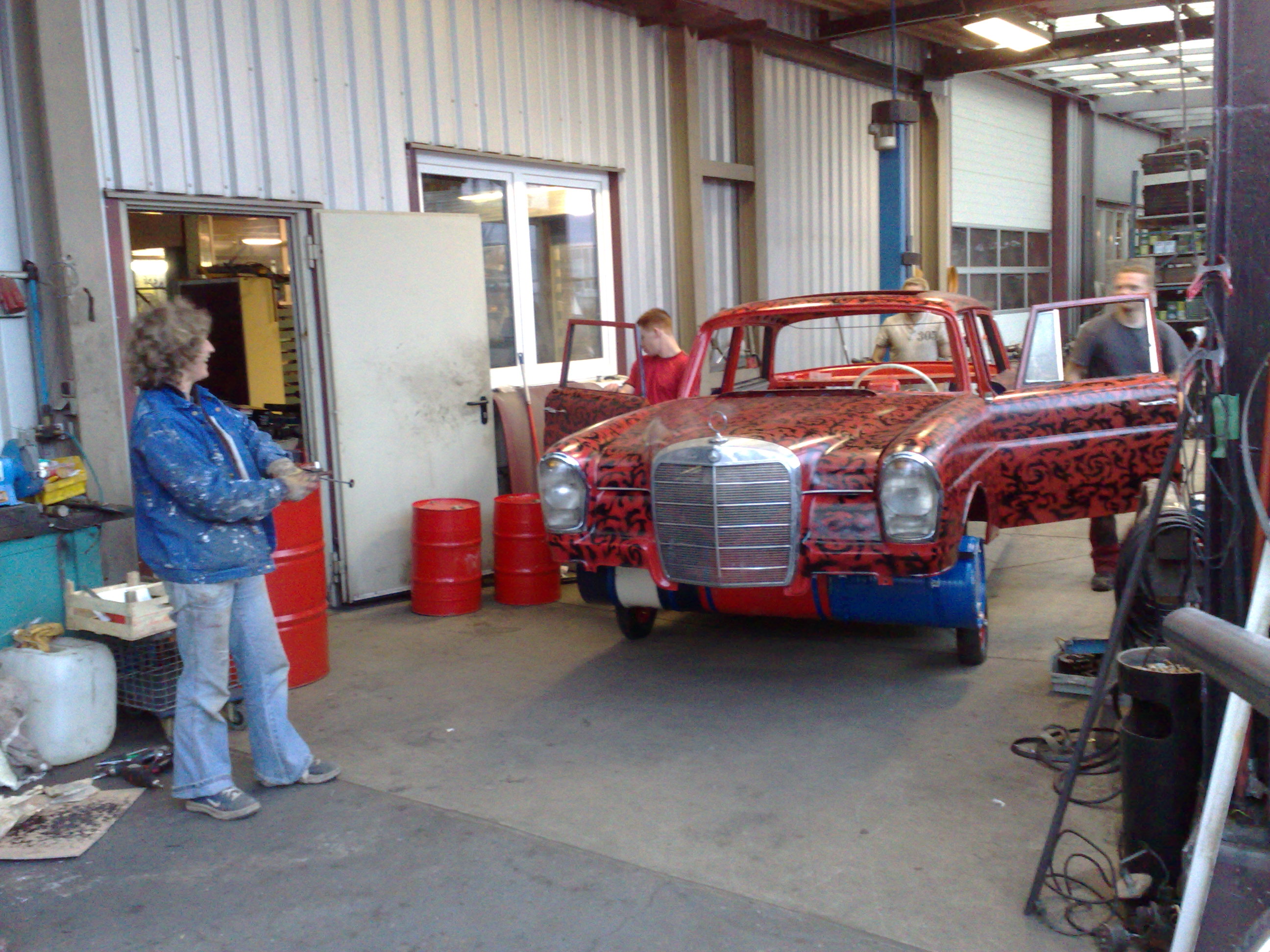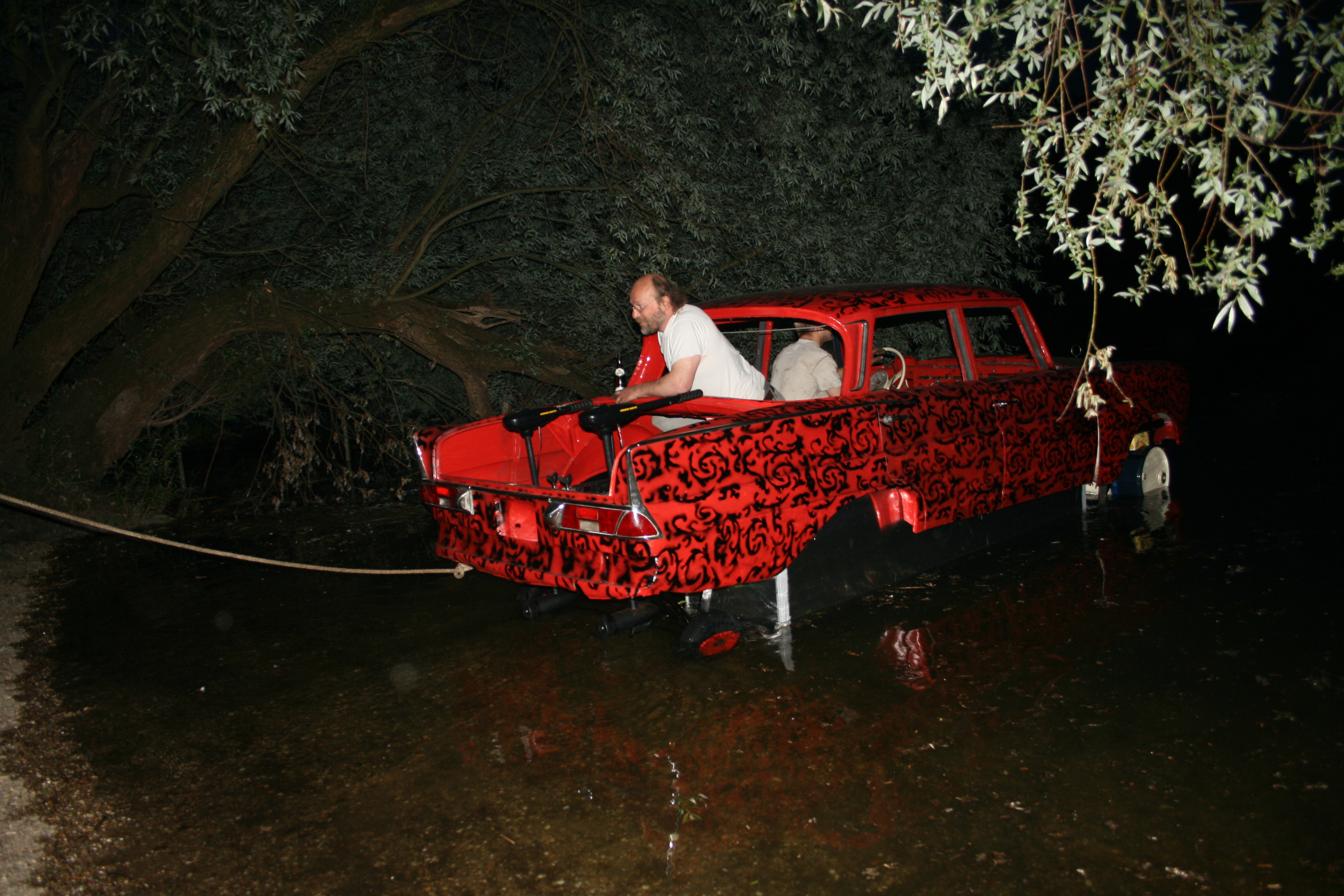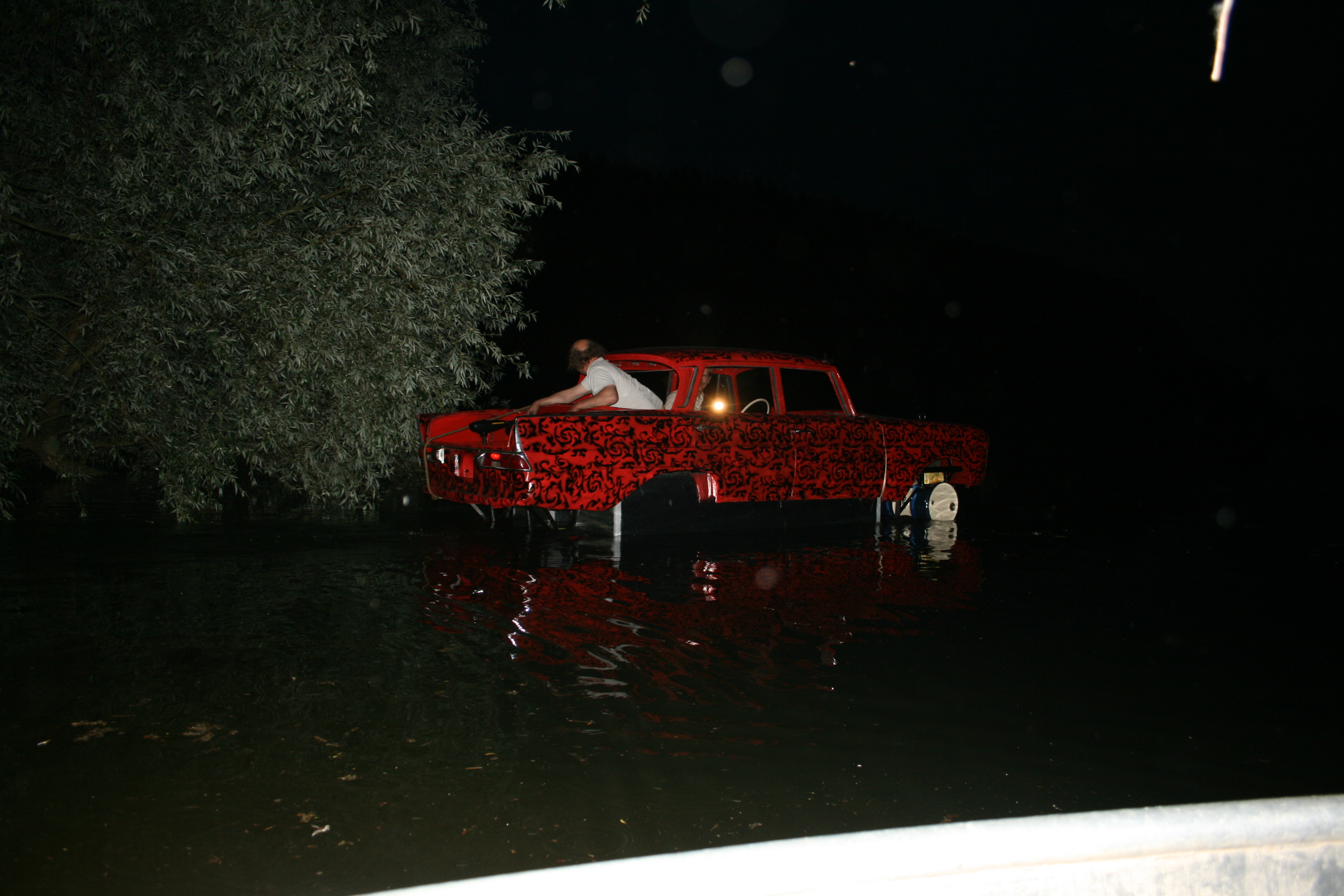 Der Hauptschwimmkörper wird gebaut. Als Sinkschutz dienen alte Ölfässer, die im vorderen und hinteren Bereich angebracht werden. Kotflügel und Motorhaube werden wieder montiert und erste rötliche gestalterische Maßnahmen werden ergriffen.