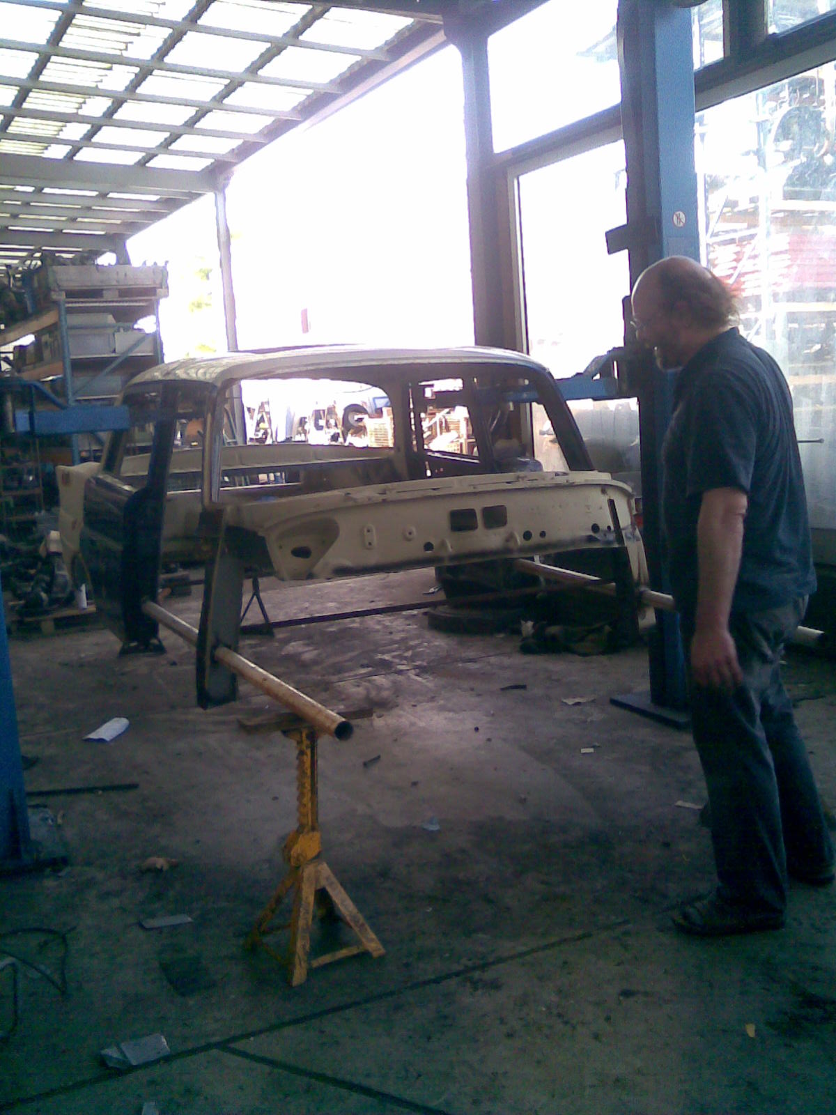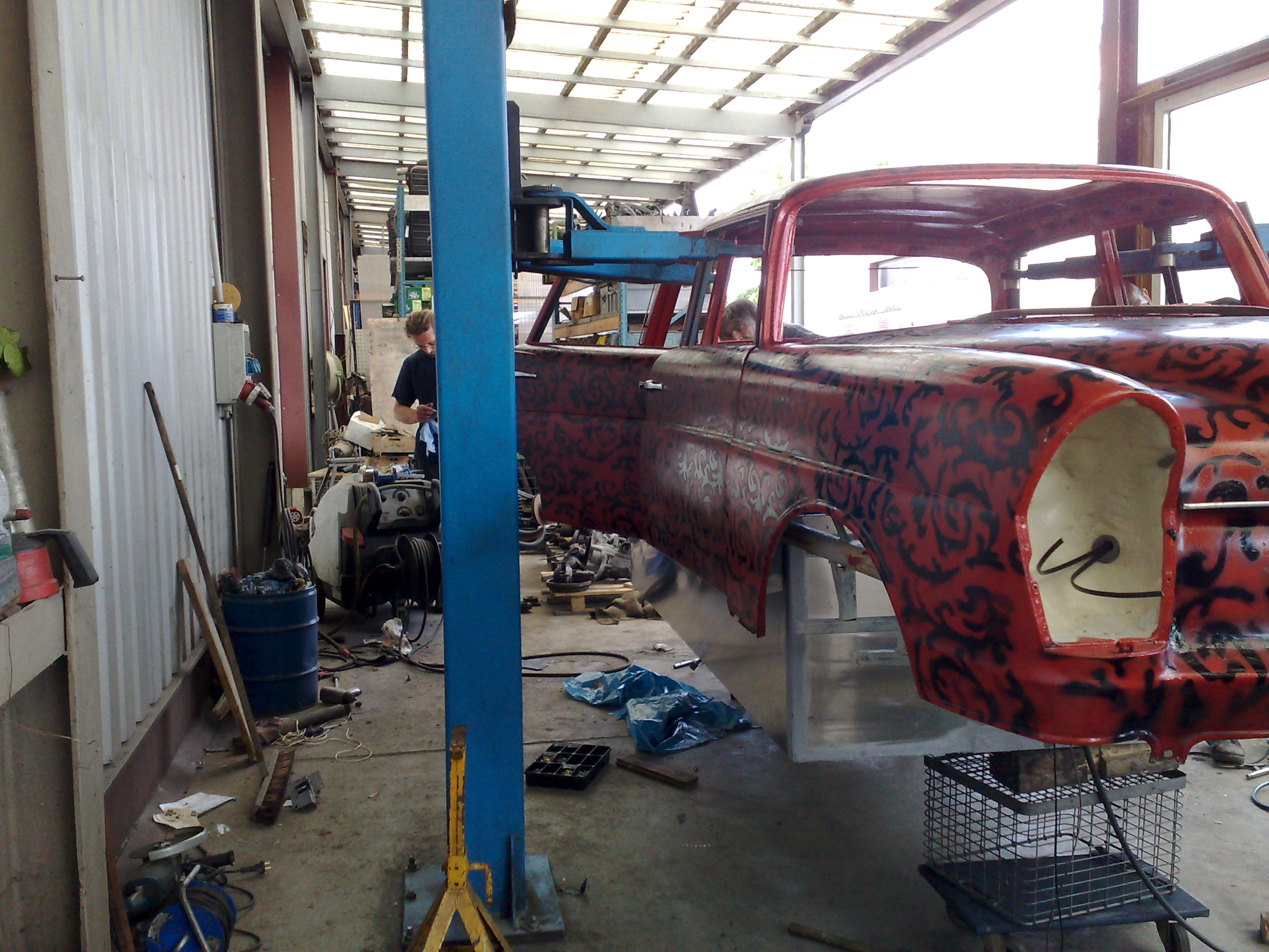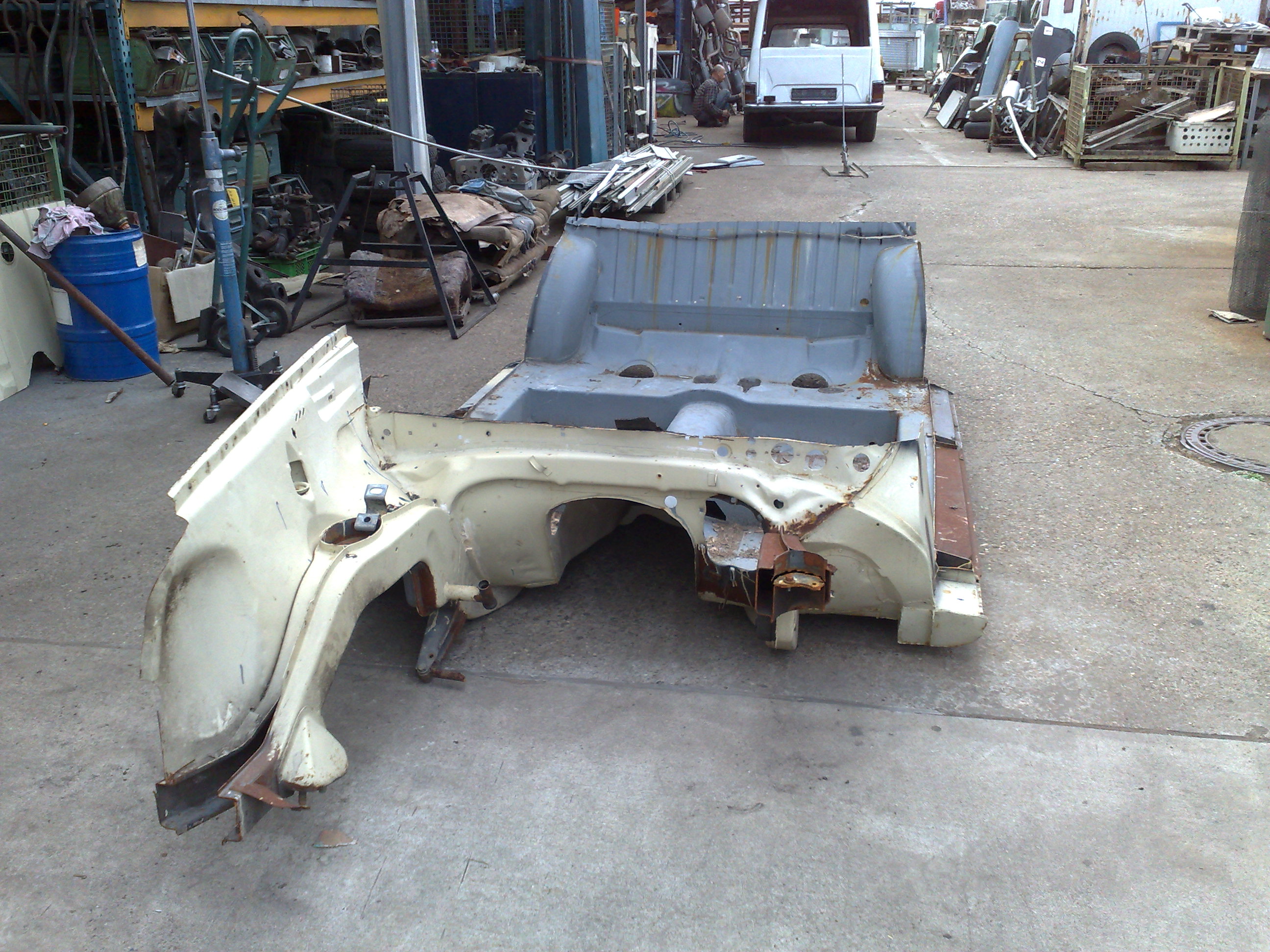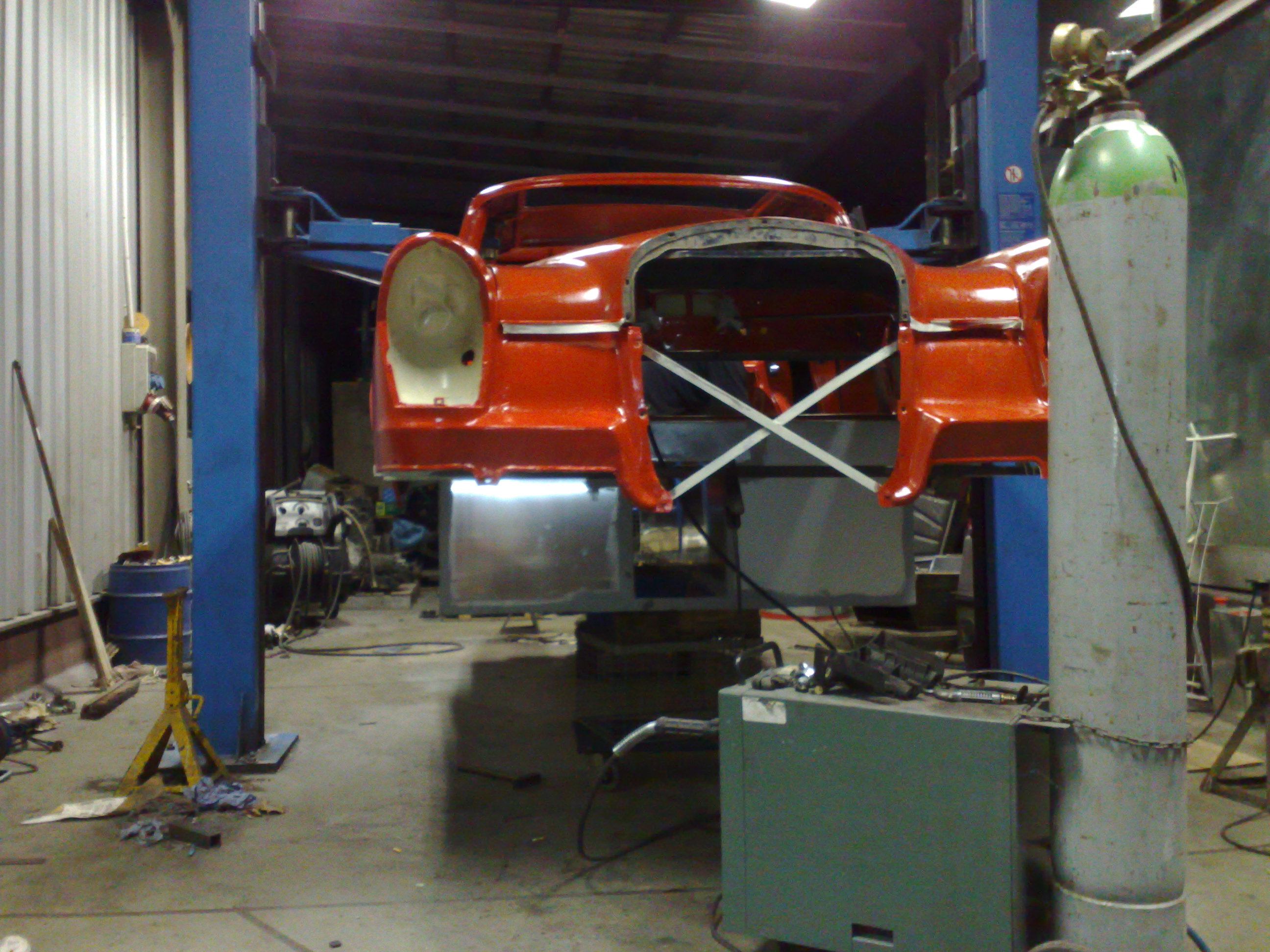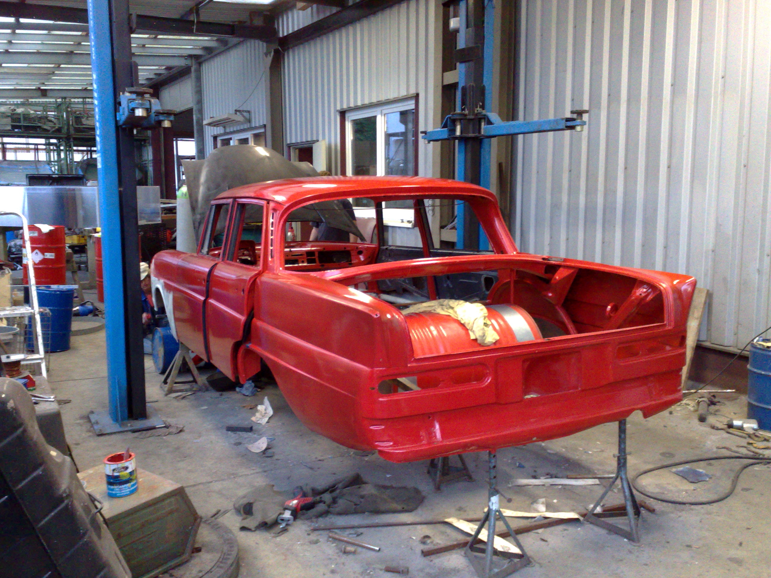 Der Hauptschwimmkörper wird gebaut. Als Sinkschutz dienen alte Ölfässer, die im vorderen und hinteren Bereich angebracht werden. Kotflügel und Motorhaube werden wieder montiert und erste rötliche gestalterische Maßnahmen werden ergriffen.