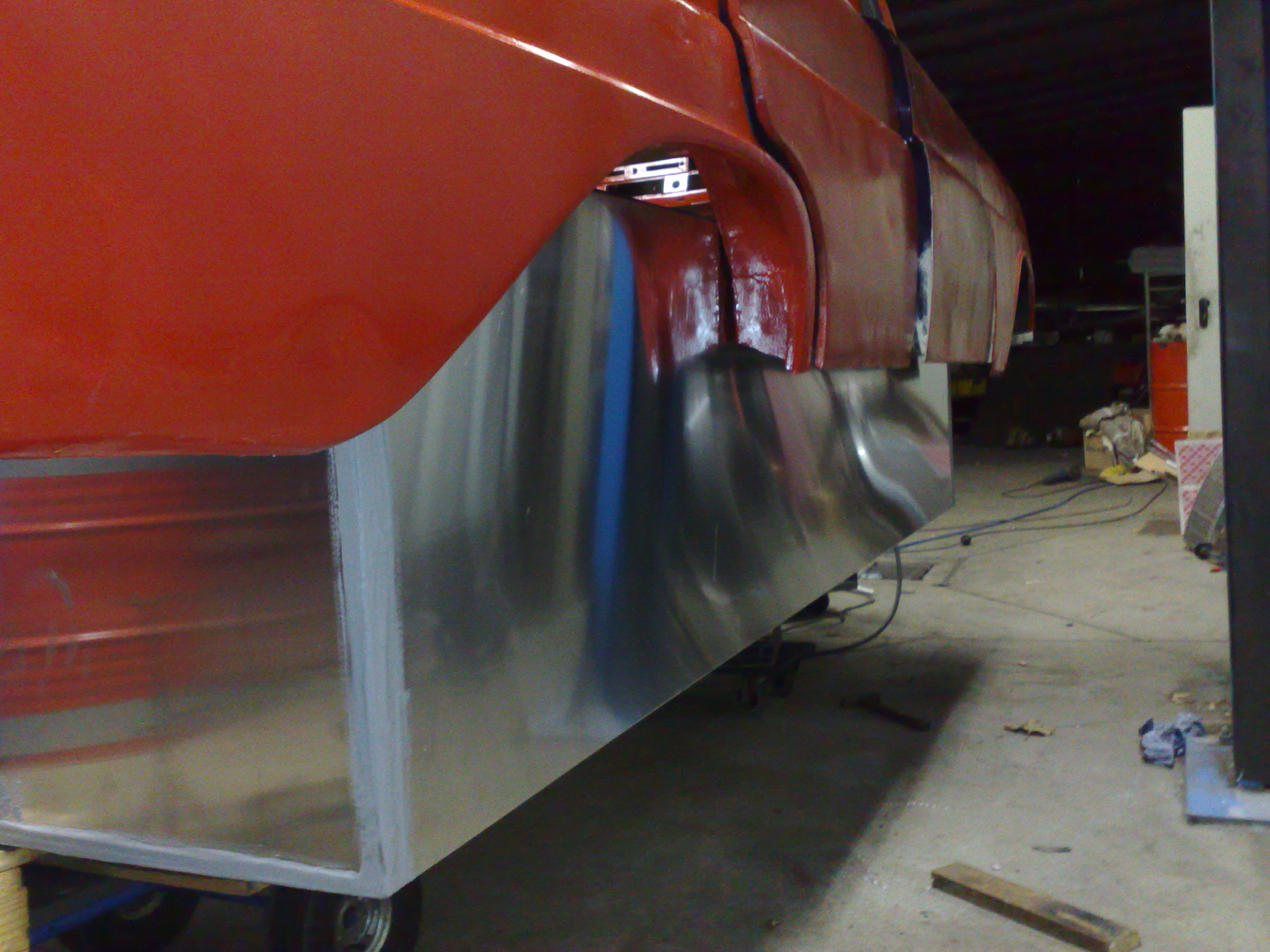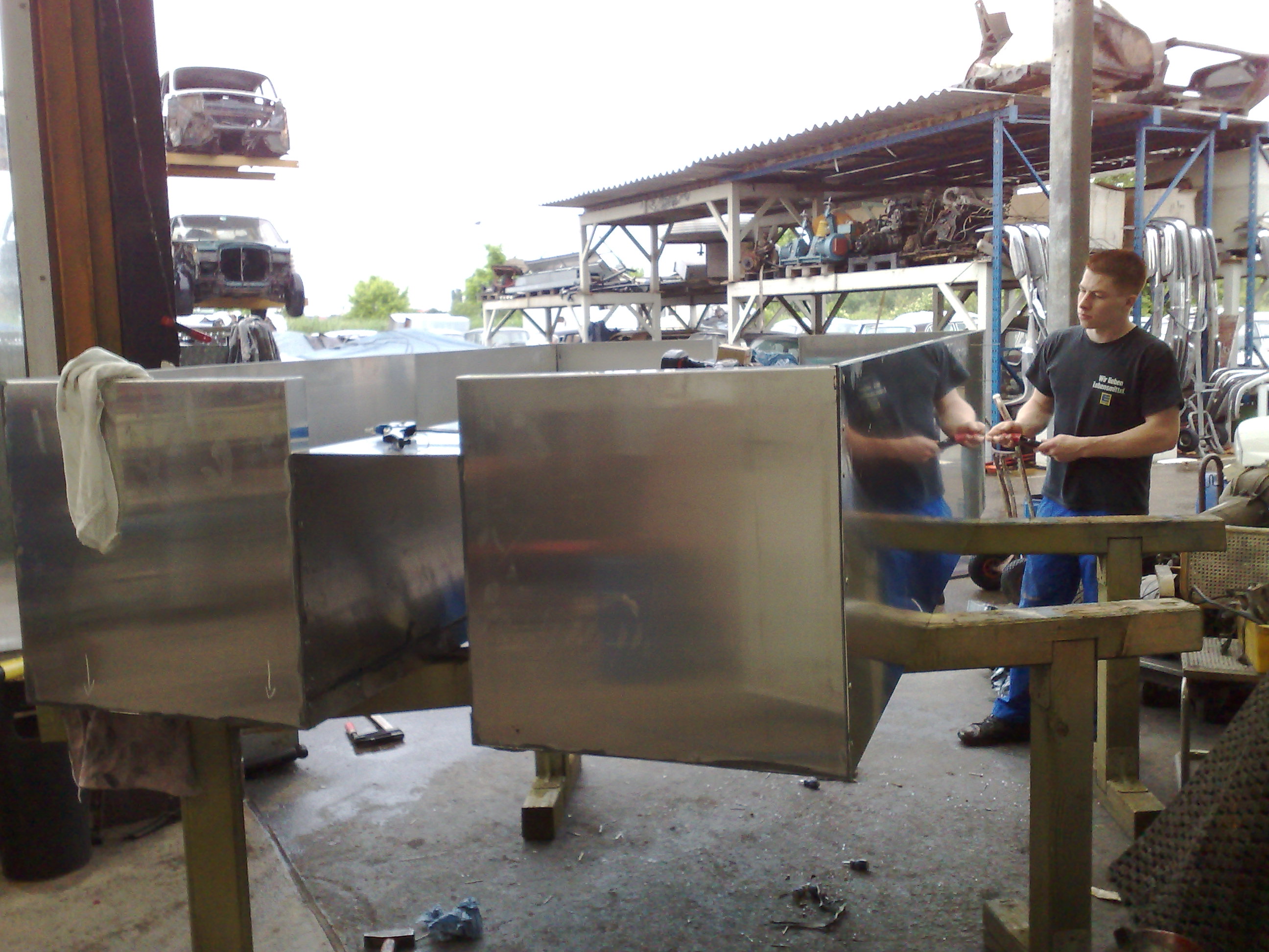 Projektbeginn – eine geeignete Flosse wird auserkoren, von überflüssigem Blech befreit und mit Rohren verstärkt. Shoppingtour: Alu-Blech für den Schwimmkörper.